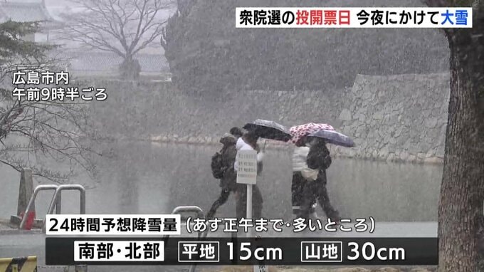現在、中国地方上空には強い寒気が流れ込んでいて、今夜遅くにかけて雪の降り方が強まる見込みです。県内では南部の平地も含め、広い範囲で大雪となるでしょう。9日正午までの24時間に、南部や北部の平地の多い所では、15センチ雪が降ると予想されています。