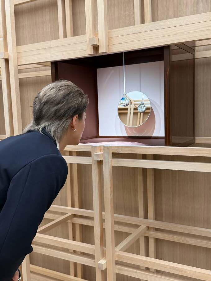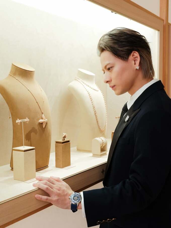 さらに、自身の腕に大ぶりな時計を着用し、ベージュのトルソーに飾られたジュエリーや、希少な懐中時計を間近で観察する姿など、メゾンの世界観に没入する様子が多角的に捉えられています。