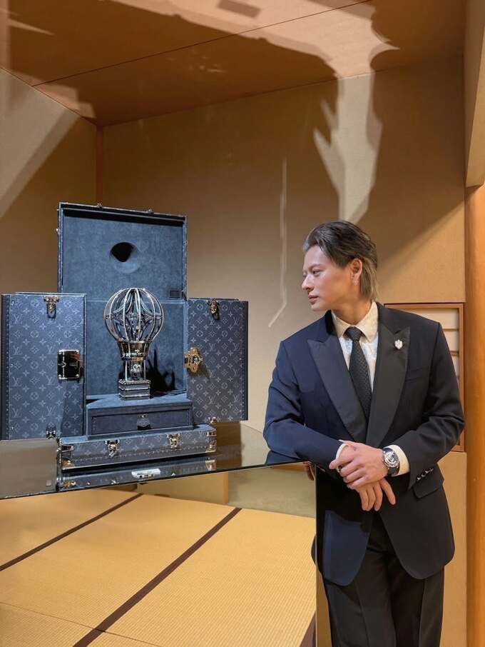 また、和の意匠を凝らした空間でモノグラム・キャンバスのケースに収められた精巧なタイムピースを熱心に眺める様子や、展示ケースの前で真剣な眼差しを向けるカットも披露。