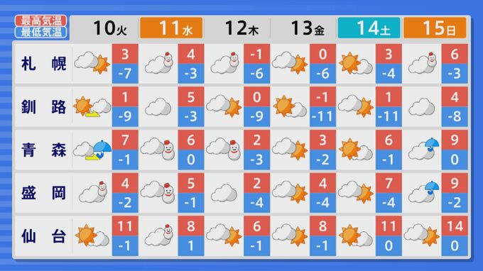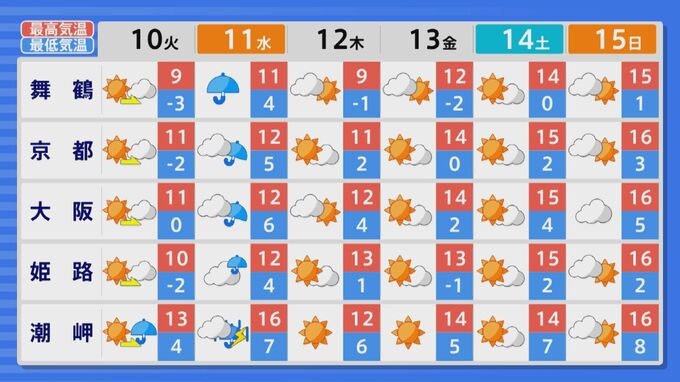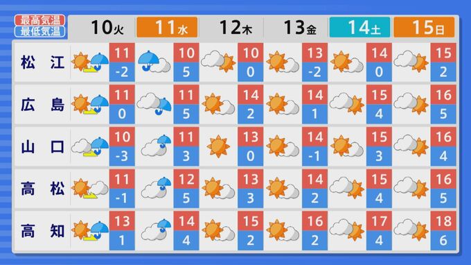 各地の週間天気です。九州や中国・四国では10日(火)ごろから、近畿から関東にかけては11日(水)に雨が降るでしょう。低気圧に近い金沢では11日は雨の降り方が強まるおそれがあります。