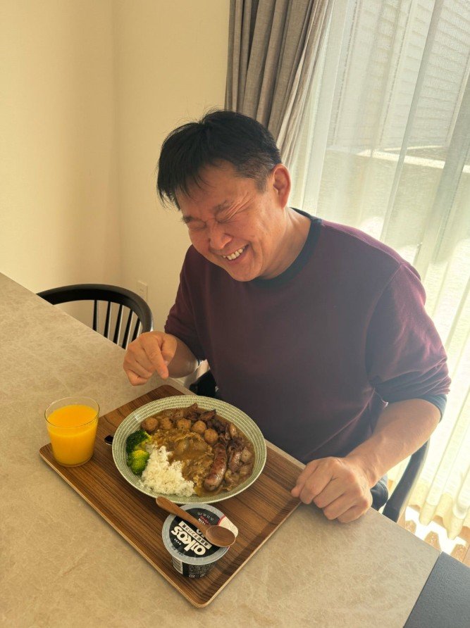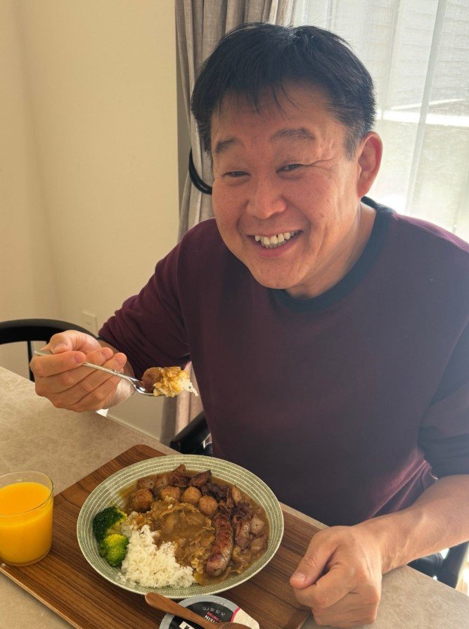 最後に投稿された写真には、窓から差し込む自然光の中、穏やかな笑顔でスプーンを手に食事を楽しむ花田さんの姿が収められています。