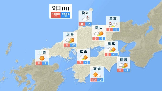 四国地方では、引き続き9日明け方にかけて、山地を中心に大雪となり、平地でも大雪となる所があるでしょう。