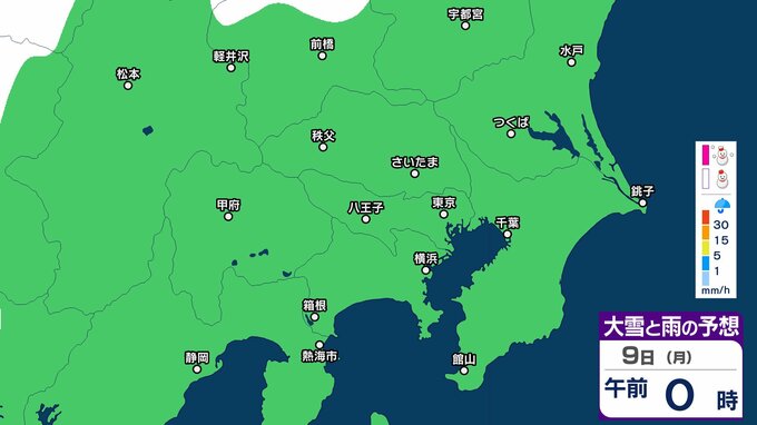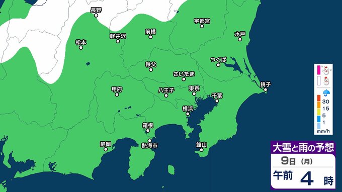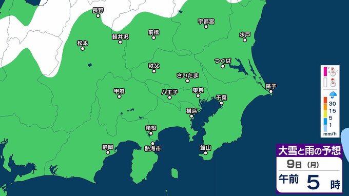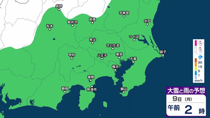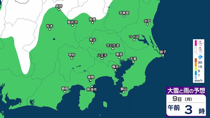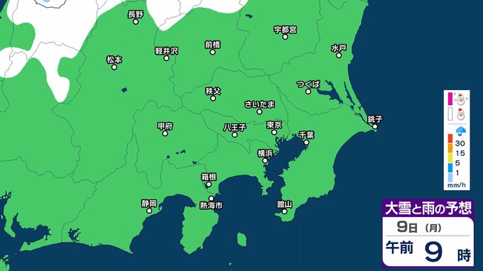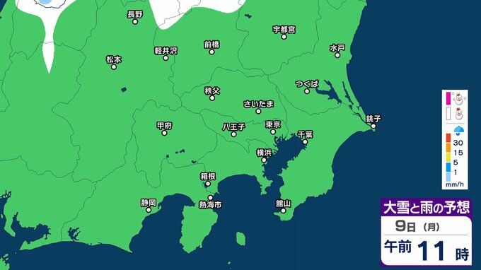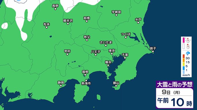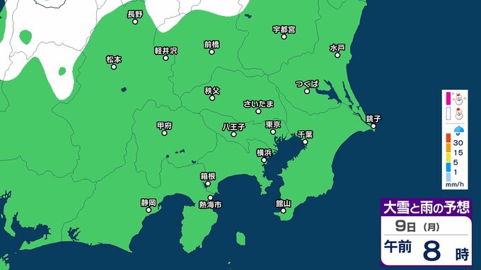 関東甲信地方では、9日明け方にかけて積雪や路面の凍結による交通障害に警戒してください。また、架線や電線、樹木への着雪、なだれにも注意してください。
