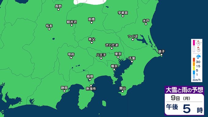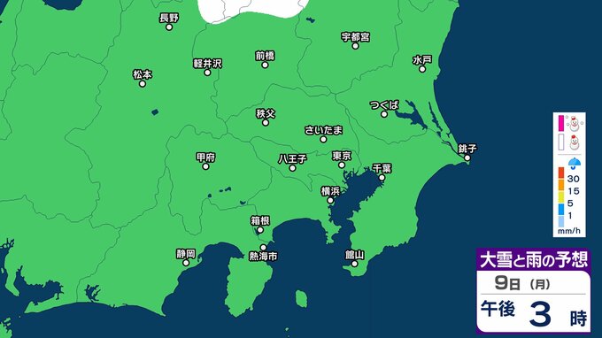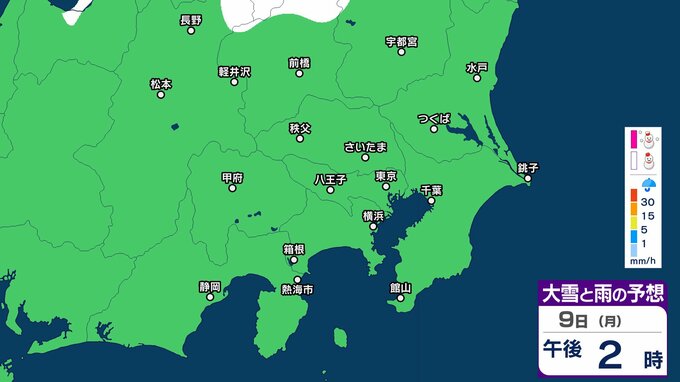 【雪雨の予想】東京・栃木・群馬・埼玉・茨城・千葉・神奈川・長野・山梨 8日(日)~11日(水・祝)1時間ごとの雪雨シミュレーション 「あす明け方にかけて交通障害に警戒」11日(水・祝)は関東の広範囲で雨か【気象庁/8日午後5時半更新】 RSK山陽放送 2026年2月8日(日) 17:48 国内 9日(月)午後は? 関東甲信の1時間ごとの雪雨シミュレーション 関東甲信の1時間ごとの雪雨シミュレーション