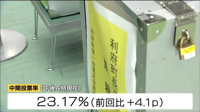 利府町内には14か所の投票所が設けられています。町の選挙管理委員会によりますと、午後4時現在の町長選の中間投票率は23.17%と、前回4年前を4.1ポイント上回っています。また、期日前投票の投票率は、前回を20.35ポイント上回る30.72%となりました。町長選の投票も午後8時までです。