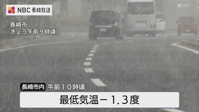 長崎市内のけさの最低気温はマイナス1.3度と一段と冷え込み、強い冬型の気圧配置の影響で、夕方にかけて断続的に雪が降りました。