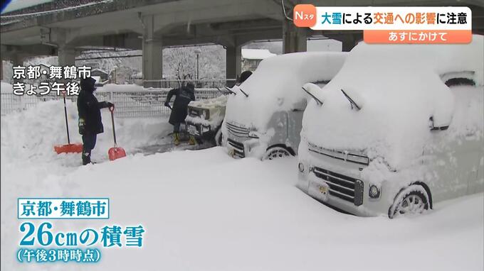 北部を中心に大雪となった近畿地方。交通網にも影響が出ています。 京都府舞鶴市では午後3時時点で26cmの積雪となり、地元の人たちが雪かきに追われました。 「いやいや参りました」 「かれこれ1時間くら…