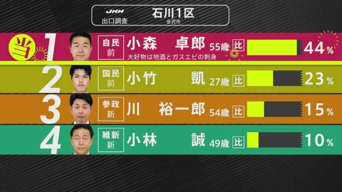 【選挙速報】衆議院選挙 石川1区で自民・小森卓郎氏の当選確実