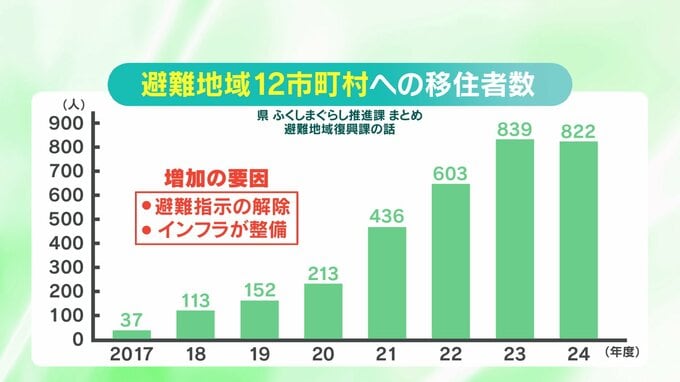 ▽深澤さんのように、双葉町や浪江町など、原発の避難対象となった12市町村への移住者の数は、増加傾向にあります。2022年度には500人を超えて603人、そして昨年度は、822人にのぼりました。増加の要因について、県は、避難指示解除やインフラの整備が進み、居住地が増えているためとしています。