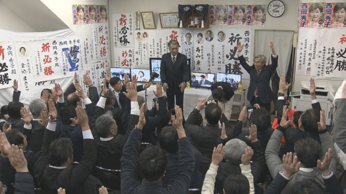 西岡さんは午後8時6分頃事務所に姿を現し、万歳三唱の声に頭を下げました。