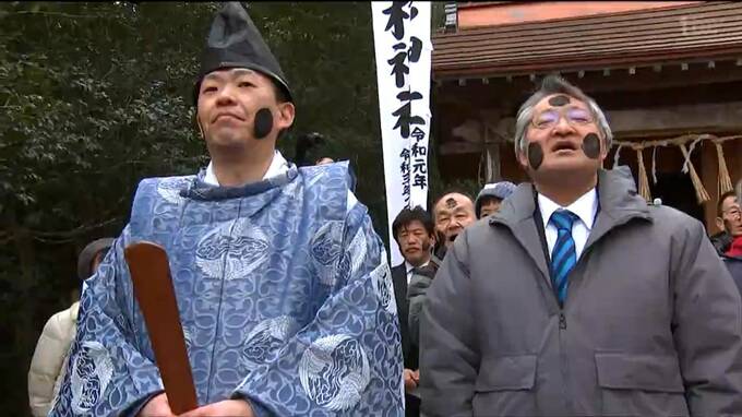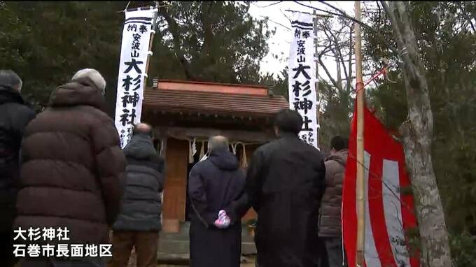 石巻市長面の大杉神社で行なわれた「アンバサン」には、氏子らおよそ20人が参列しました。すすを塗る大根につけた「すす」をおでこや頬につけていきます。