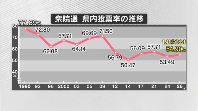 衆議院選挙 鹿児島県での投票率54.9% 前回より1.41ポイント上回る 南日本放送 2026年2月8日(日) 22:49 国内 8日に投票が行われた衆院選の鹿児島県内の投票率は、54.90パーセントで前回の衆院選を1.41ポイント上回りました。 ※前回衆院選2024年10月27日 53.49%