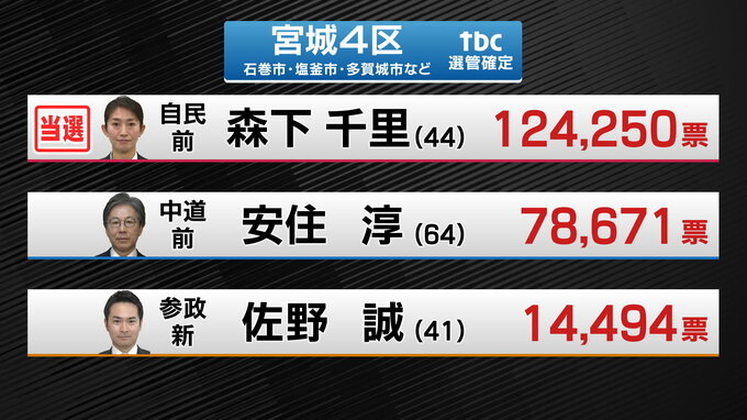 宮城4区は、自民党の森下千里氏が中道改革連合の安住淳氏を破り当選です。安住氏は10回連続で守ってきた議席を失いました。