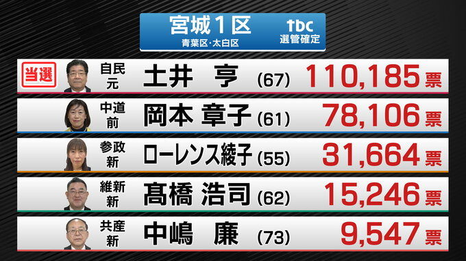宮城1区は、自民党の土井亨氏が議席を奪還し、6回目の当選を果たしました。中道改革連合の岡本章子氏は、議席を守れませんでした。
