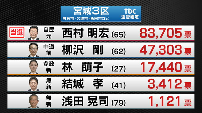 宮城3区は、自民党の西村明宏氏が7回目の当選を果たし、再選を狙った中道改革連合の柳沢剛氏は、及びませんでした。