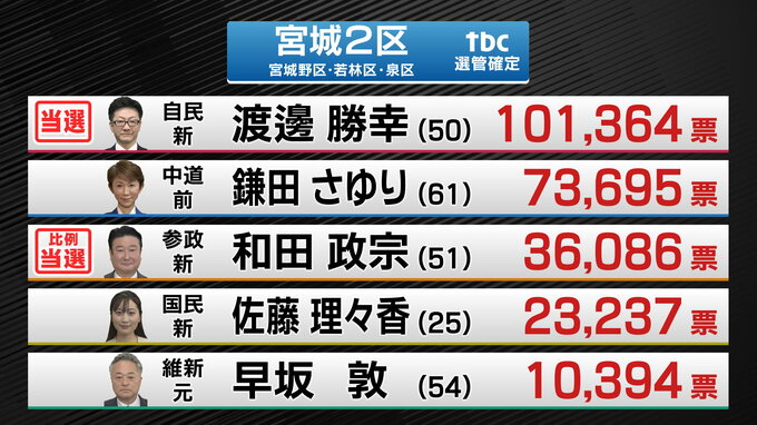 宮城2区は、自民党の渡邊勝幸氏が中道改革連合の鎌田さゆり氏らを下し、初当選しました。