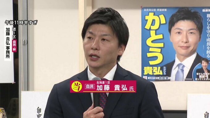 札幌市中央区と南区などが選挙区の北海道1区で、当選した自民党の新人・加藤貴弘さんの喜びの声です。