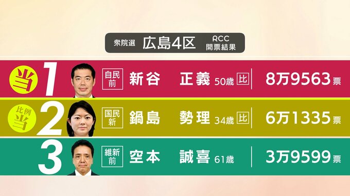 【衆議院選挙2026】広島県は6つの小選挙区全てで自民党が議席獲得 全候補者の得票数は【結果一覧】 中国放送 2026年2月9日(月) 11:03 国内 【広島4区】 当 自由民主党・前職、新谷正義氏 89,563票 当比 国民民主党・新人、鍋島勢理氏 61,335票 日本維新の会・前職、空本誠喜氏 39,599票