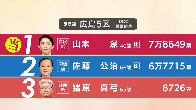 【衆議院選挙2026】広島県は6つの小選挙区全てで自民党が議席獲得 全候補者の得票数は【結果一覧】 中国放送 2026年2月9日(月) 11:03 国内 【広島5区】 当 自由民主党・新人、山本深氏 78,649票 中道改革連合・前職、佐藤公治氏 67,715票 日本共産党・新人、猪原真弓氏 8,726票