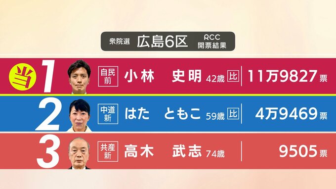 【衆議院選挙2026】広島県は6つの小選挙区全てで自民党が議席獲得 全候補者の得票数は【結果一覧】 中国放送 2026年2月9日(月) 11:03 国内 【広島6区】 当 自由民主党・前職、小林史明氏 119,827票 中道改革連合・新人、はた ともこ氏 49,469票 日本共産党・新人、高木武志氏 9,505票