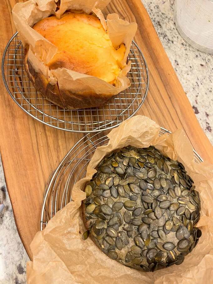 作り方は、これらの材料をすべてミキサーにかけ、ケーキの型に入れて上からパンプキンシードをトッピングするというシンプルなもの。180度のオーブンで約40分焼くとのことです。