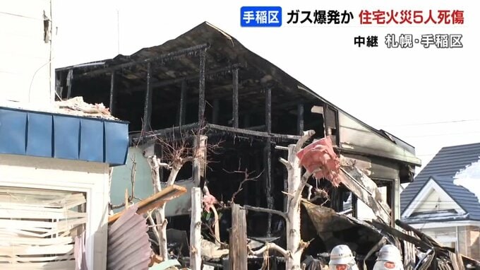 けさ早く札幌市手稲区の住宅で爆発を伴う火事があり、5人が死傷しました。現場から中継です。奥の焼け焦げた骨組みの前にも、もともと住宅があったと思われます。辺りは爆発によって木材が散乱していて、近隣の住…