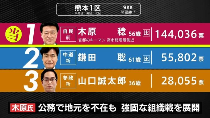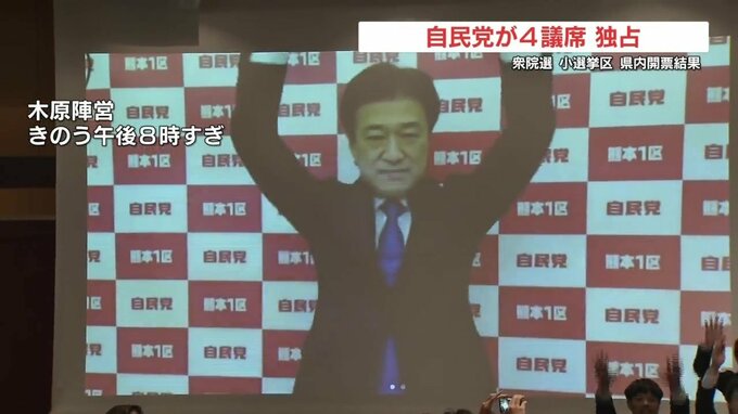 衆議院選挙 熊本選挙区は自民独占 4人それぞれのバンザイ 投票率は56.70% 熊本放送 2026年2月9日(月) 12:16 国内 【熊本1区 木原稔氏 選挙事務所 万歳】 熊本1区は、官房長官である自民党・前職の木原稔氏が公務で地元を不在にしながらも強固な組織戦を展開し、新人2人を退けました。