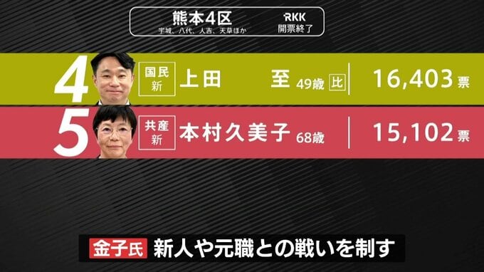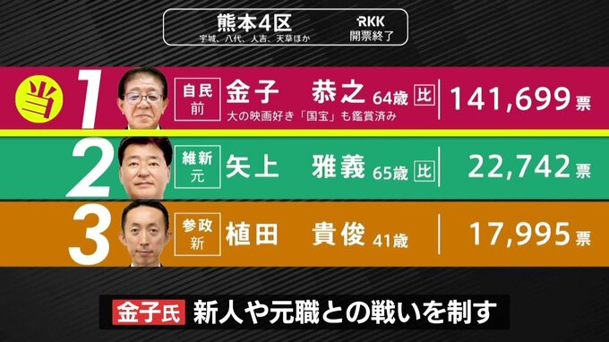 衆議院選挙 熊本選挙区は自民独占 4人それぞれのバンザイ 投票率は56.70% 熊本放送 2026年2月9日(月) 12:16 国内 【熊本4区 金子恭之氏 選挙事務所 万歳】 5人が立候補し、混戦となった熊本4区は、国土交通大臣、自民党・前職の金子恭之氏が新人や元職との戦いを制しました。 投票率は、56.70%で前回より4.64ポイント上まわりました。