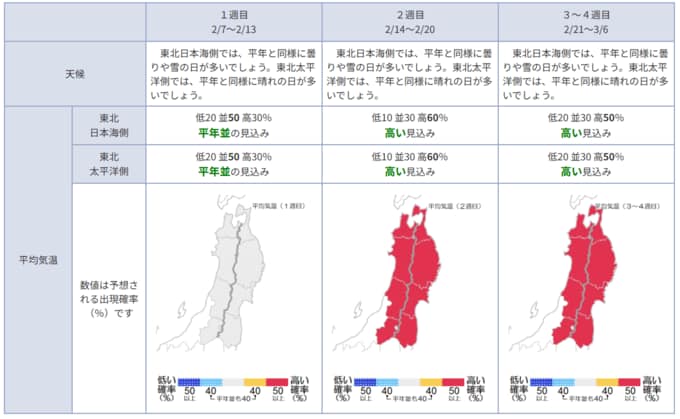 東北日本海側:平年並の見込み 東北太平洋側:平年並の見込み