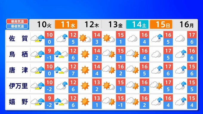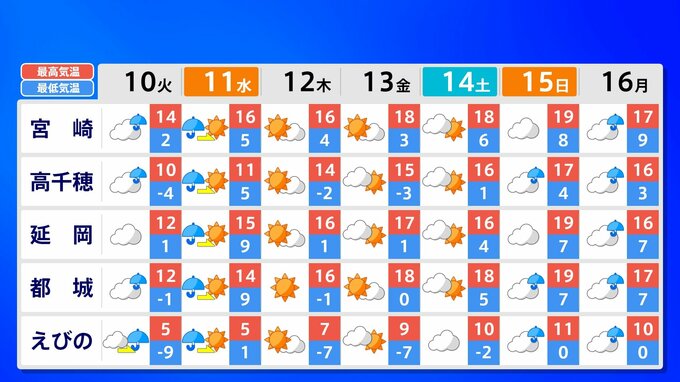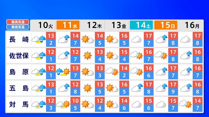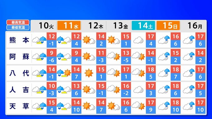 【九州 待望の雨】あすあさって まとまった雨 今週後半 寒さ緩む 暖かいバレンタイン【雨のシミュレーション /九州各都市の週間予報】福岡・佐賀・長崎・大分・熊本・宮崎・鹿児島「あすは必ず傘を持って!」 南日本放送 2026年2月9日(月) 12:18 国内 天気 九州地方 各都市の週間予報(10日(火)~ 16日(月)) 週間予報を画像で掲載しています(各都県5か所ずつ)。福岡県の場合、福岡市・北九州市・飯塚市・久留米市・大牟田市です。 しだいに寒さが緩み、今週後半は3月並みの陽気が戻るでしょう。 この記事をはじめから → 【九州 待望の雨】雪シミュレーション