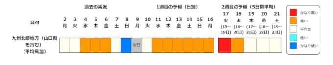 九州北部地方(山口県を含む)の向こう2週間の気温は、寒気の影響を受けにくいため高い日が多く、15日頃からはかなり高くなる可能性があります。農作物の管理等に注意してください。また、今後の気象情報等に留意してください。