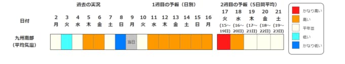 九州南部・奄美地方の向こう2週間の気温は、寒気の影響を受けにくいため高い日が多く、15日頃からはかなり高くなる可能性があります。農作物の管理等に注意してください。また、今後の気象情報等に留意してください。