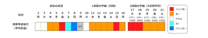 関東甲信地方の向こう2週間の気温は、寒気の影響を受けにくく暖かい空気が流れ込みやすい時期があるため高く、15日頃からはかなり高くなる見込みです。農作物の管理等に注意してください。積雪の多い地域ではなだれに注意してください。また、今後の気象情報等に留意してください。