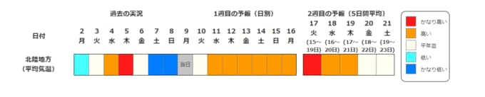 北陸地方の向こう2週間の気温は、寒気の影響を受けにくいため高い日が多く、15日頃からはかなり高くなる可能性があります。農作物の管理等に注意してください。積雪の多い地域ではなだれに注意してください。また、今後の気象情報等に留意してください。