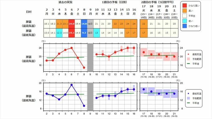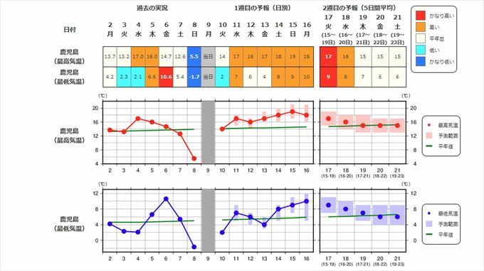 九州南部・奄美地方の向こう2週間の気温は、寒気の影響を受けにくいため高い日が多く、15日頃からはかなり高くなる可能性があります。