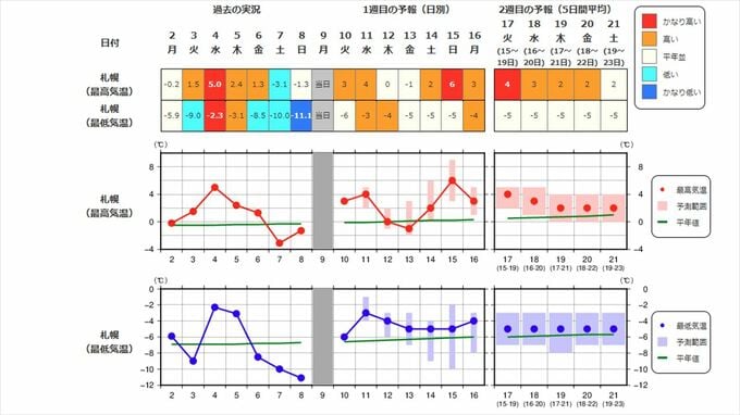 北海道地方の向こう2週間の気温は、寒気の影響を受けにくいため高い日が多く、15日頃からはかなり高くなる可能性があります。