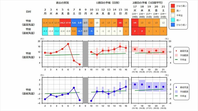 関東甲信地方の向こう2週間の気温は、寒気の影響を受けにくく暖かい空気が流れ込みやすい時期があるため高く、15日頃からはかなり高くなる見込みです。