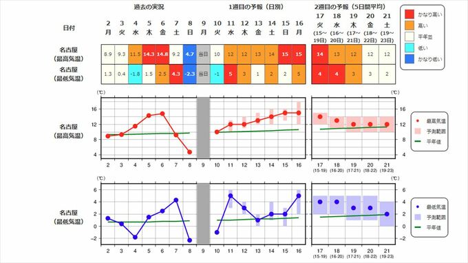 東海地方の向こう2週間の気温は、寒気の影響を受けにくく暖かい空気が流れ込みやすい時期があるため高い日が多く、15日頃からはかなり高くなる見込みです。