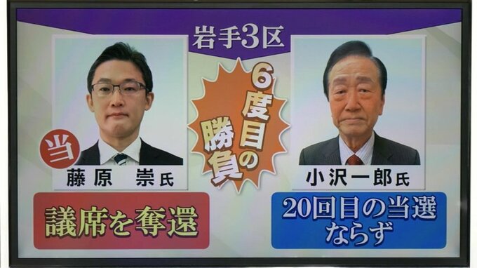 自民党の元職、藤原崇さんが中道改革連合の前職、小沢一郎さんの20回目の当選を、阻止して返り咲きました。