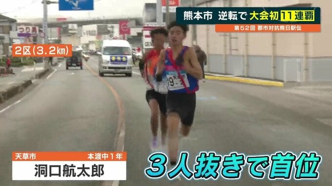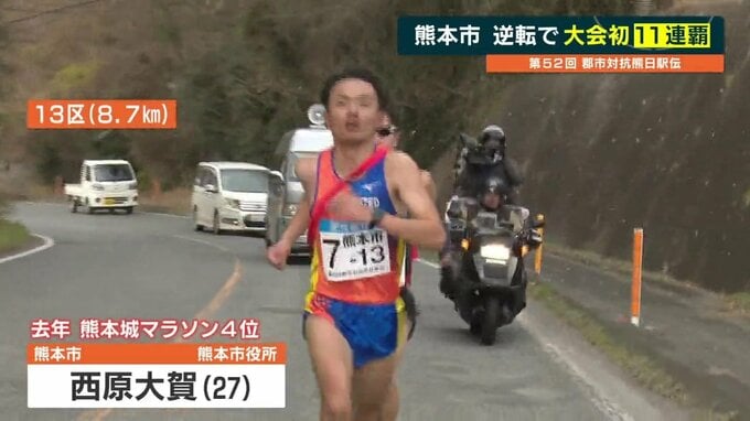 追いかける展開となった熊本市は、選手層の厚さが強みです。13区では熊本市の西原大河、去年の熊本城マラソン4位の実力者が天草市を捉えて逆転し、先頭に躍り出ます。