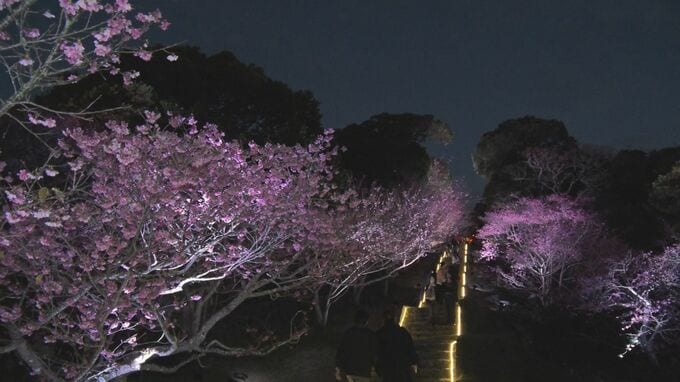 今帰仁城跡とその周辺には、約600本のカンヒザクラが植えられていて、県内外から多くの観光客が訪れています。今年で19回目を迎えた「今帰仁グスク桜まつり」は8日まで行われ、日が暮れると桜と城壁がライトアップされ、あたり一面は幻想的な雰囲気に包まれました。