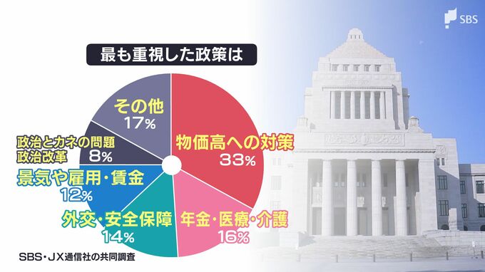 「もっとも重視した政策は」というところで、やはり物価高対策33%、年金・医療・介護16%、そして外交・安全保障が14%となっています。