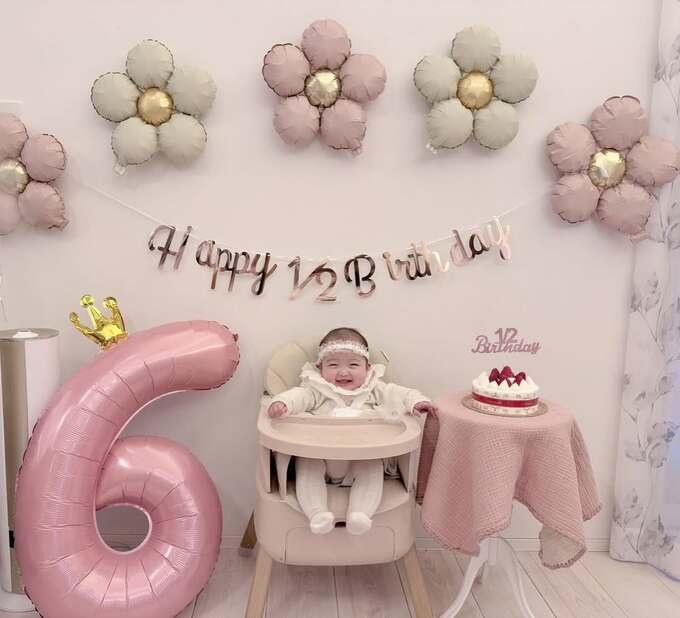 投稿された1枚目の写真では、夢空ちゃんが薄いピンクのベビーチェアに座り、白い衣装にカチューシャを着けたお姫様のような姿を披露。背景には「Happy 1/2 Birthday」のガーランドや、数字の「6」の風船、可愛らしいケーキが並べられています。