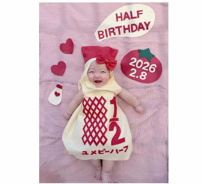 2枚目の写真では、一転してユーモア溢れる姿に。ピンクの布団の上で夢空ちゃんが、マヨネーズのパッケージを模した衣装を着て、頭に大きな赤いリボンを付けて笑顔を見せています。衣装には「ユメピーハーフ」と記され、周囲にはハート形の小物とマヨネーズの小物、「HALF BIRTHDAY」と書かれた白い吹き出しなどが飾られています。
