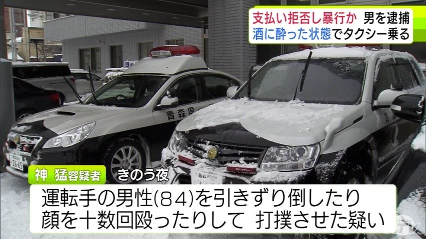 神容疑者は8日午後10時過ぎ青森市にあるタクシー会社の敷地内で、運賃4900円の支払いを免れるために、運転手の84歳の男性を車外で引きずり倒したり顔を十数回殴ったりして、全身を打撲させた疑いがもたれています。