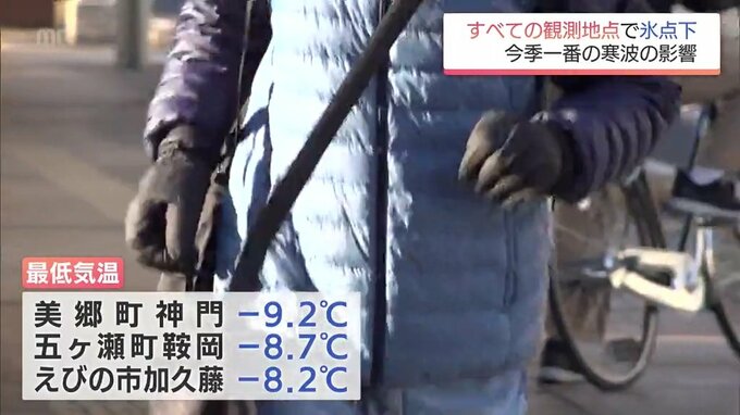 今シーズン一番の寒波の影響で9日朝の宮崎県内はすべての観測地点で、最低気温が0℃を下回る厳しい冷え込みとなりました。9日の県内は強い寒波の影響で朝は各地で気温が下がり、最低気温は、美郷町神門で‐9.2℃、…