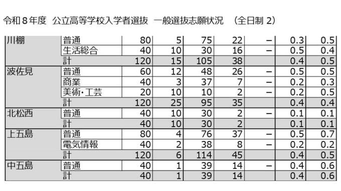 【全校掲載】長崎県立高校入試2026「一般選抜」志願倍率 長崎西(理系)が2.2倍でトップ 7割以上で定員割れ 志願者数0の学校も 長崎放送 2026年2月9日(月) 18:31 国内 川棚・波佐見・北松西・上五島・中五島 川棚・波佐見・北松西・上五島・中五島でもすべて1を下回ってます。【画像⑨】