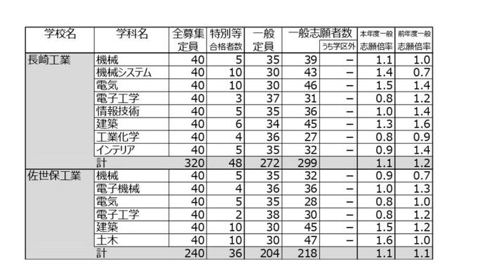 【全校掲載】長崎県立高校入試2026「一般選抜」志願倍率 長崎西(理系)が2.2倍でトップ 7割以上で定員割れ 志願者数0の学校も 長崎放送 2026年2月9日(月) 18:31 国内 長崎工業・佐世保工業 ◆【画像を見る】長崎県立高校入試「一般選抜」志願倍率 ◆この記事を最初から読む 長崎工業では電気で1.5倍、電機システムで1.4倍など8つの学科のうち5学科で1を上回りました 佐世保工業でも土木で1.6倍、建築で1.5倍などとなっています。詳しくは【画像⑪】から確認してください。