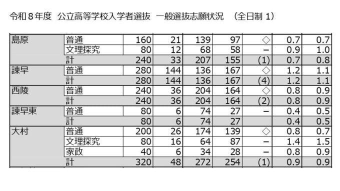 【全校掲載】長崎県立高校入試2026「一般選抜」志願倍率 長崎西(理系)が2.2倍でトップ 7割以上で定員割れ 志願者数0の学校も 長崎放送 2026年2月9日(月) 18:31 国内 島原・諫早・西陵・諫早東・大村 ◆【画像を見る】長崎県立高校入試「一般選抜」志願倍率 ◆この記事を最初から読む 諫早は志願倍率1.2倍で、前年度を0.1ポイント上回りました。また大村の文理探求は1.4倍と高倍率になりました。 その他の学校・学科では1を下回っています。詳しくは【画像④】から確認してください。