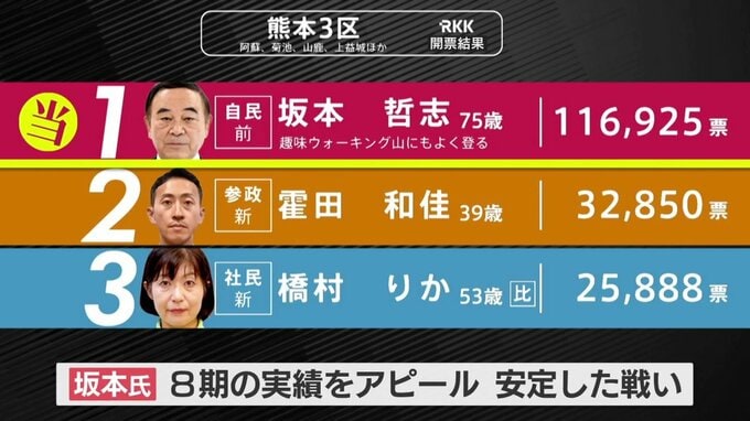 自民党・前職の坂本哲志氏が8期の実績をアピール。安定した戦いを見せました。